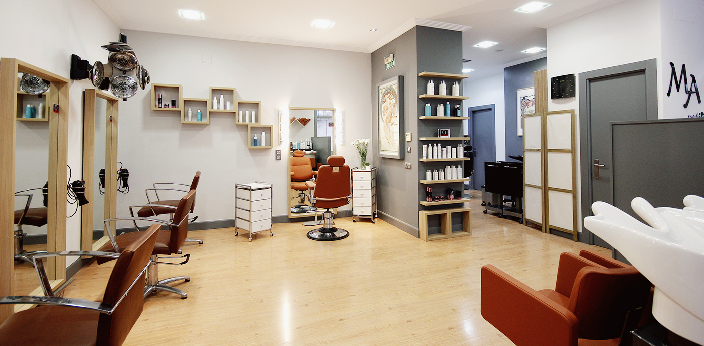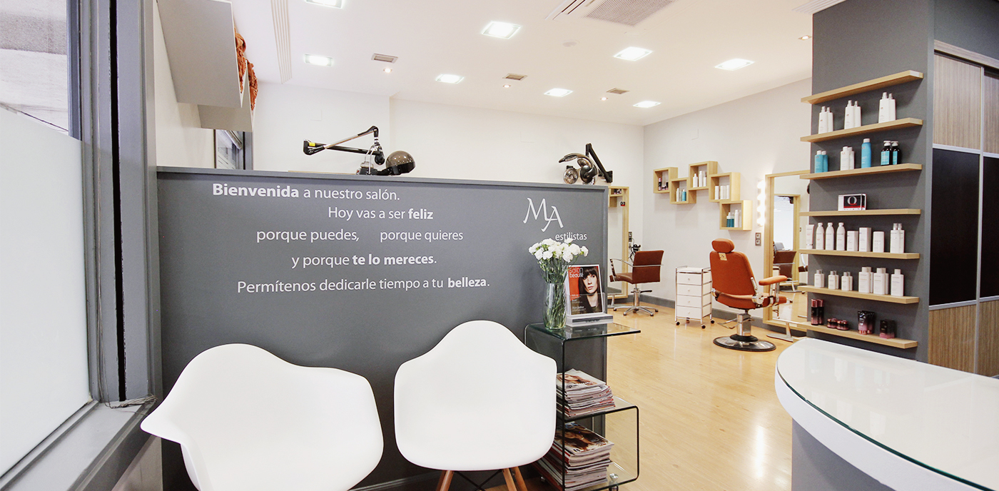 Asesoría de interiorismo para la renovación del local de MA Estilistas: paleta de colores, materiales, estilo, imagen, cartelería y elección de mobiliario.