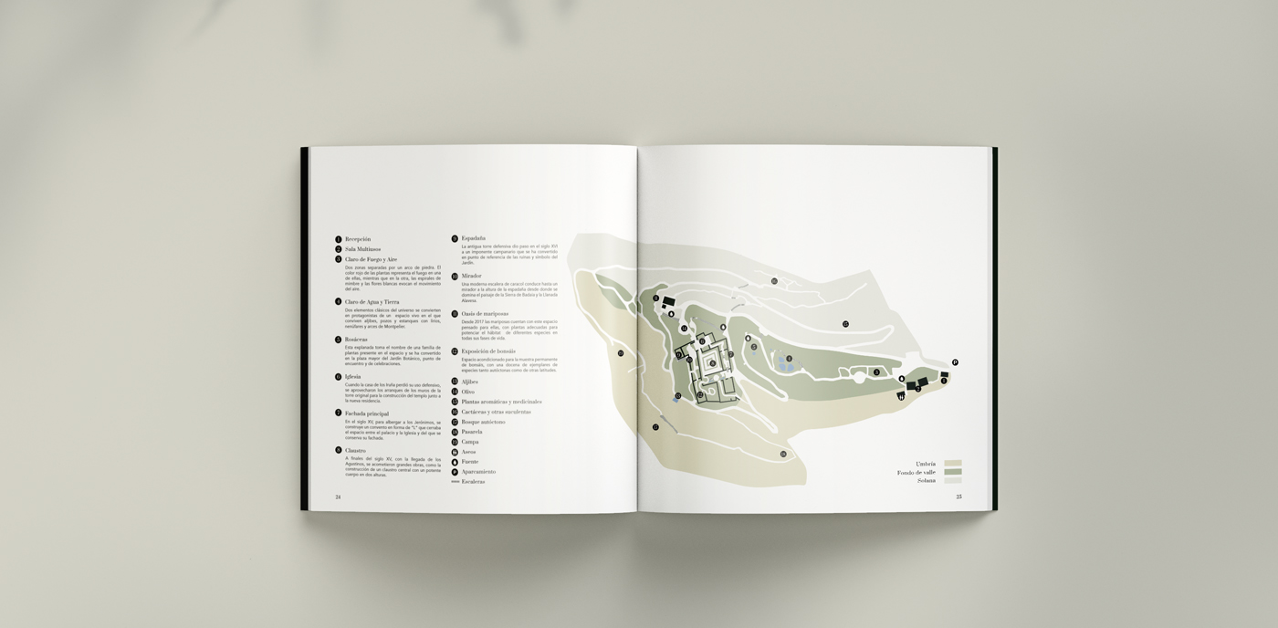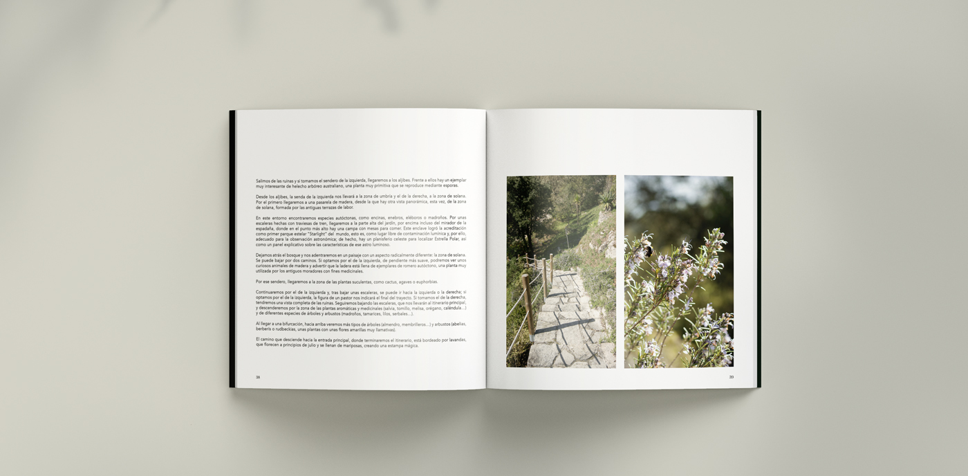 El proyecto consiste en el diseño editorial, maquetación, coordinación, traducción e impresión de un libro-guía para la promoción y difusión del Jardín Botánico de Santa Catalina. Consta de 52 páginas, con lomo cosido y un tamaño cerrado de 20 x 20 cm. Su diseño se plantea con márgenes y vacíos generosos que aportan aire, livianidad y limpieza. Se combinan varias tipografías según la jerarquía de los textos: una contemporánea y clara, de fácil lectura para los cuerpos de texto y otra con un toque más clásico y elegante, para títulos y subtítulos. El encargo incluye, además, las fotografías de los diferentes espacios del jardín, de gran importancia dado el carácter visual de la guía.