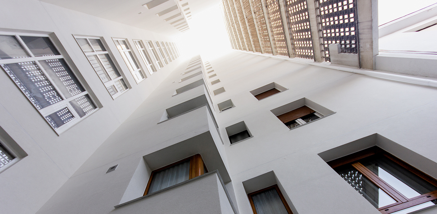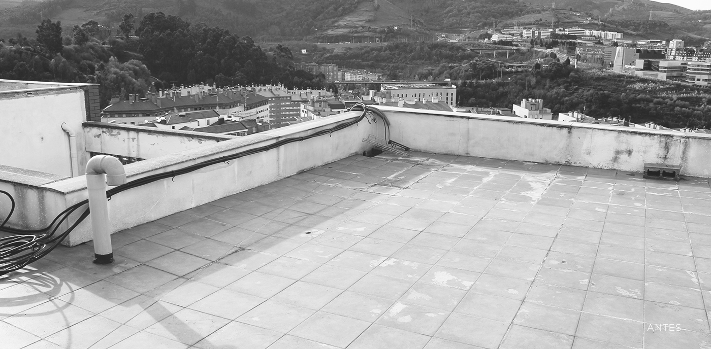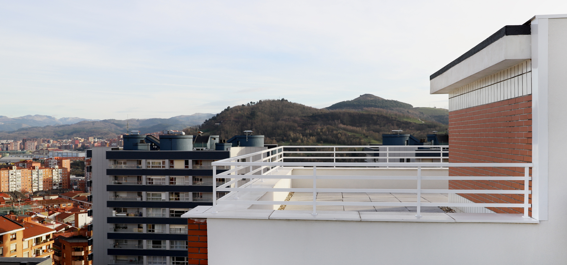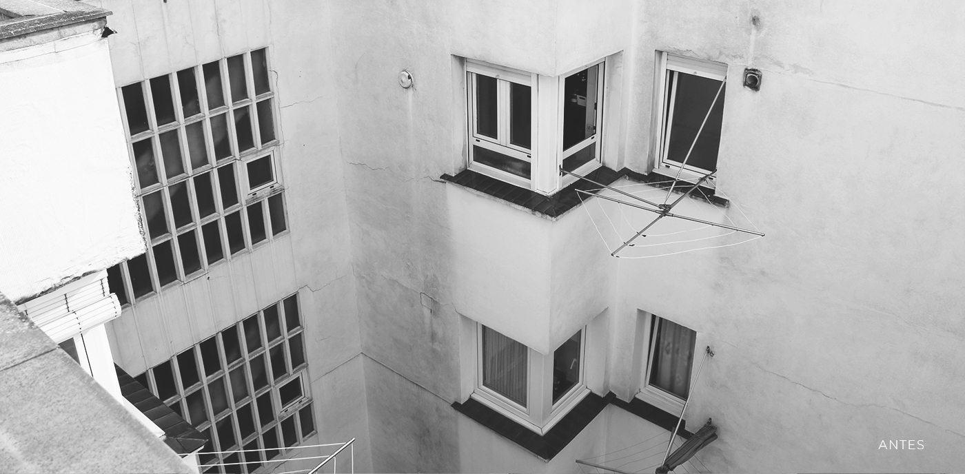 Proyecto de ejecución, dirección de obra y coordinación de seguridad y salud para la rehabilitación energética de las fachadas de los patios interiores del inmueble situado en Santutxu 28, originalmente terminadas en enfoscado y pintura, mediante instalación de fachada SATE, así como rehabilitación de la azotea, sustituyendo embaldosado cerámico por losa filtrante con aislamiento incorporado. Se renuevan también las ventanas del núcleo de comunicaciones y se instalan barandillas, escalera y línea de vida para labores de mantenimiento en la azotea.