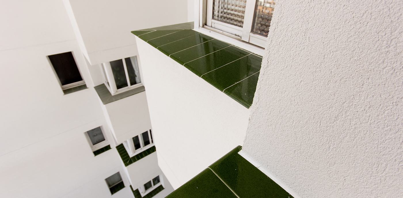 Sistema KlimaExpert de KERAKOLL de SATE con aislamiento térmico reforzado con grafito y bandas de lana de roca ROCKWOOL a modo de cortafuegos, situadas en los frentes de forjado cada dos plantas.